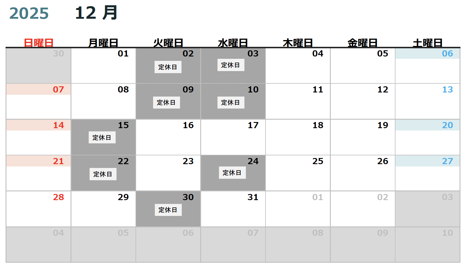 ◆ 定休日 :火曜日・水曜日(祝日の場合は前日または後日)